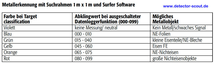 Verglichen mit vielen anderen Systemen, welche nur unterschiedliche Delay - Empfindlichkeitskanäle in Farbkarten abbilden können, gibt die Deepmax - X6 - Version zusätzlich Informationen über die mögliche Metallart, bzw. Objektgröße, so können anhand der Daten Fehlsignale oder Übersteuerungen sofort erkannt werden. Gleichzeitig werden aber auf mindestens ein oder zwei Kanälen Daten bereitgestellt, welche brauchbar sind. Wenn Sie die unterschiedlichen Bilder vergleichen suchen Sie die Signale ( Kontakte ), welche keine Bodenstörungen und eher kräftig von der Intensität sind um Kleinteile an der Oberfläche zu unterdrücken. Manche Kontakte erscheinen auf einem Scan und verschwinden auf dem anderen und geben somit nutzbare Informationen über Abklingverhalten der Wirbelströme oder Bodenstörungen die durch magnetisierbare Eisenoxide ausgelöst wurden. Es ist möglich zwei oder mehr unterschiedliche, nebeneinander angeordnete Metallobjekte voneinander zu trennen, anhand des Vergleichs von Delay und Target classification Farbkarten / Scans. In den Delay Scans wird z. B. oft nur eine große Anzeige über mehrere Spuren angezeigt und beim Vergleich mit der Metallunterscheidung deuten im selben Bereich mehrere unterschiedliche Farben auf unterschiedliche Metalle nebeneinander hin. |